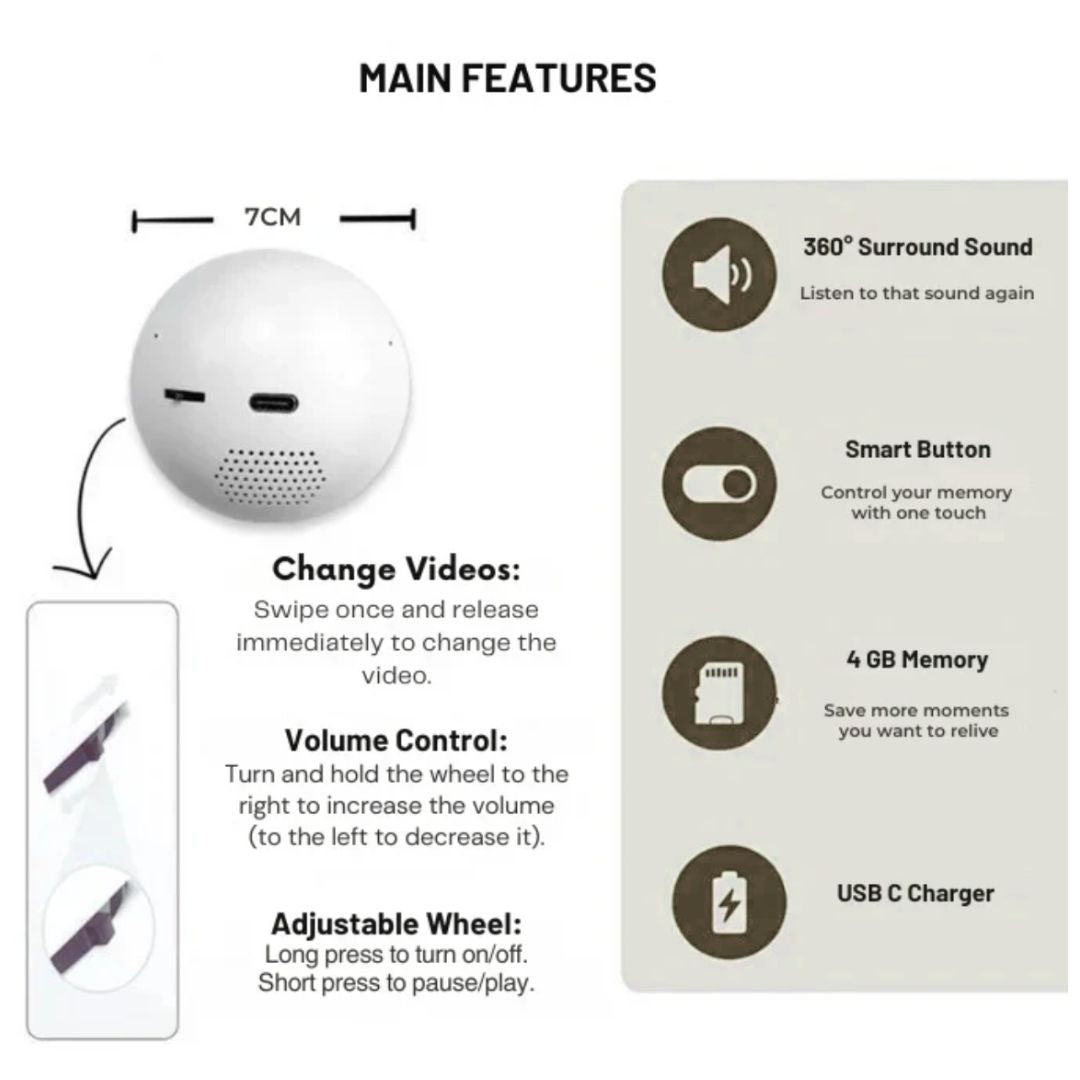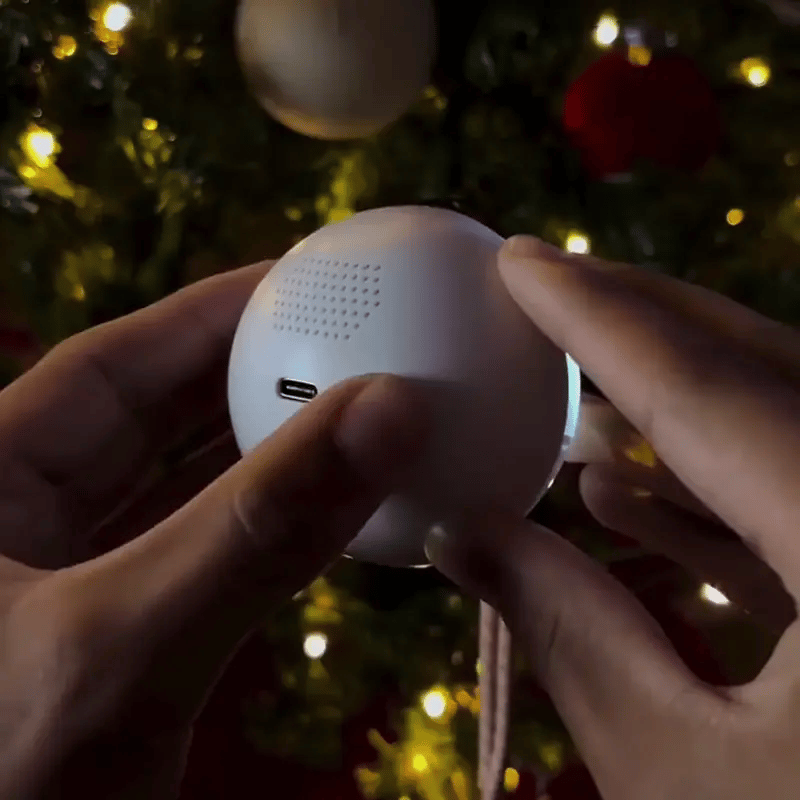 CutePaws Sphere is a crystal ornament with a built-in display that plays your personalized video. Simply connect it to your phone or laptop via USB-C and upload your file. The video will loop automatically once it's on the ornament.